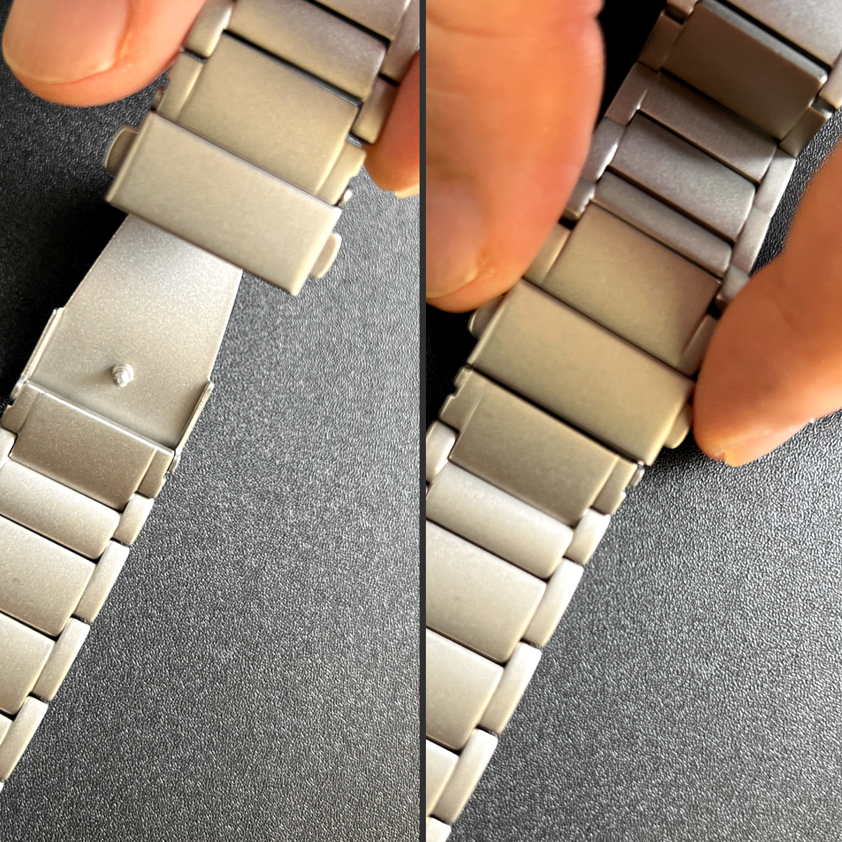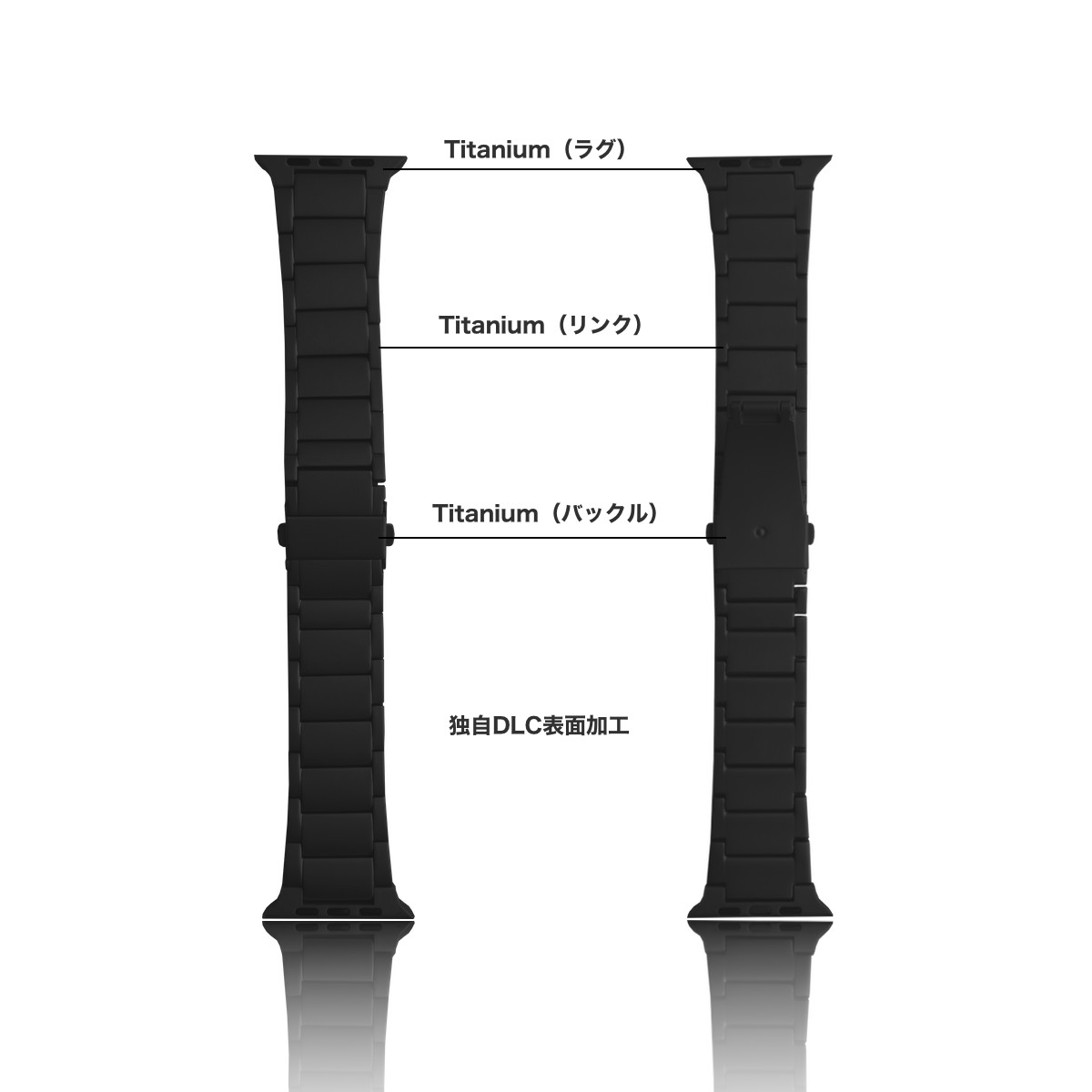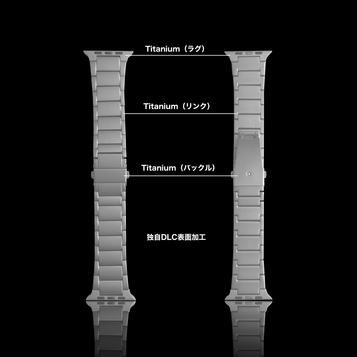 リンクだけでなく、バックル、ラグまでも高品質チタニウムを使用。
