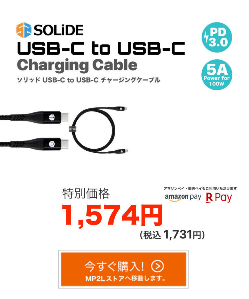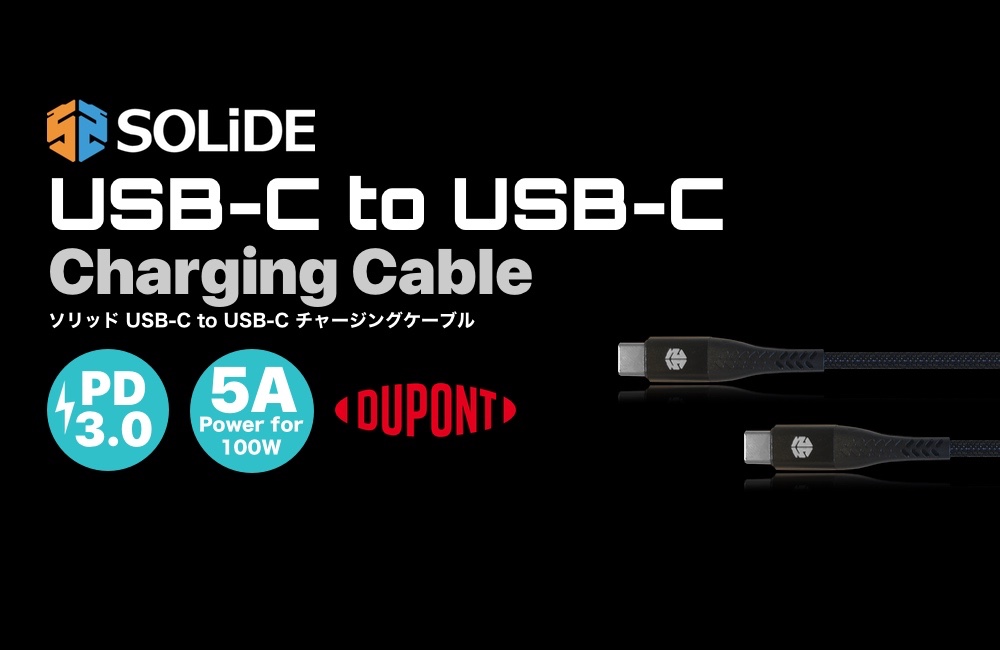 【SOLIDE USB-C to USB-Cチャージングケーブル】は、USB-C PD【3.0】完全対応。出力は最大5A・100W対応。100W出力ポートを搭載した大容量モバイルバッテリーにも完全対応します。