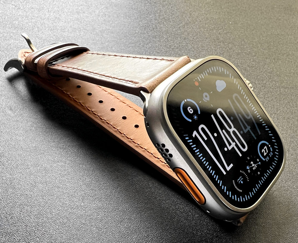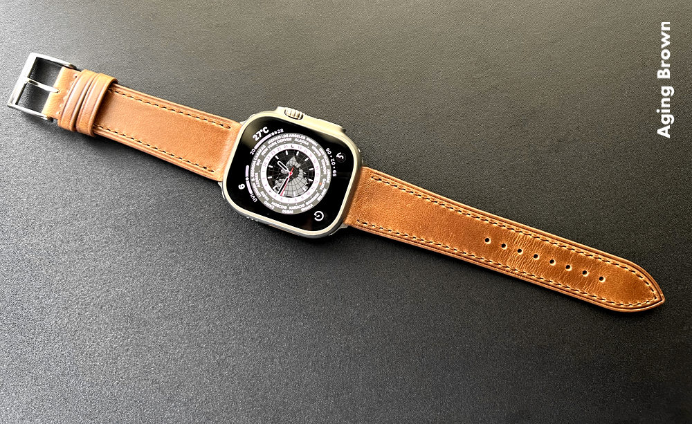 最大幅22mmと広めなので、Ultraとのデザインマッチングは言わずもがな。堅牢。重厚感。じっくりと油脂を漬け、染み込ませた特別な革。これこそ、ホーウィンクロムエクセル。エイジング(経年変化)が楽しみ過ぎます・・・