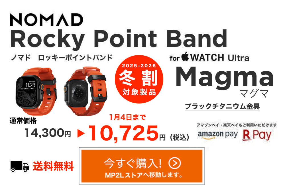 NOMAD Sport Band では既に大人気のオレンジカラーが、いよいよ Rocky Point Band にも登場!新たに、バックルとベルトループ部にApple Watch Ultraと同じ「グレード5」のチタニウムを使用。