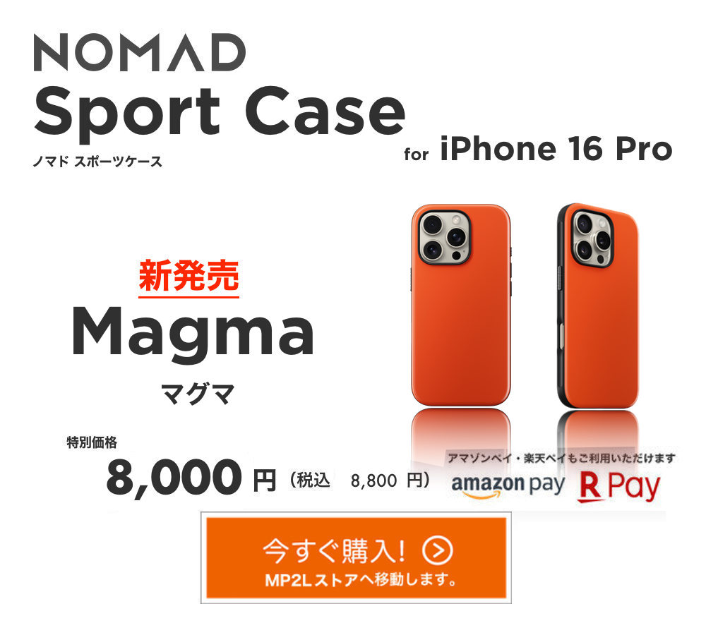 さらに、2024年モデルから新素材仕様になった NOMAD Sport Case for iPhone 16 Pro にも新色としてマグマが登場。新素材サテンPETにより、指紋、ほこり、傷にも強く。