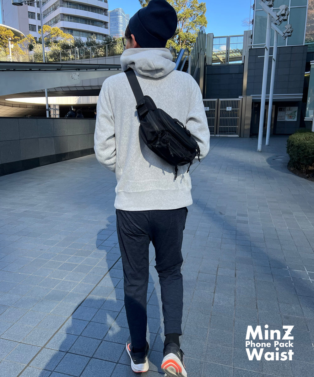 MinZ Phone Pack Waistは、【ウエストバッグ】スタイルと、【スリングバッグ】スタイルの2通りの基本スタイリングでお楽しみいただけます。例えば、目的地ではウエストバッグ、移動の時はスリングバッグで。もちろん、その日の気分でもどうぞ。