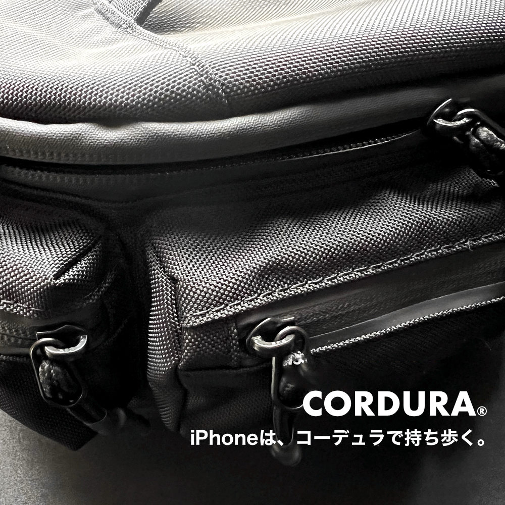 付属のナイロンストラップを装着すれば、iPhoneを収納して使用できるミニスリングバッグに。「iPhone以外にアイテムが不要」な時の移動に。MinZ Phone Pack Waistの【バッグインバッグ】は、収納アイテム整理・保護という機能性だけでなく、単体でバッグになります。
