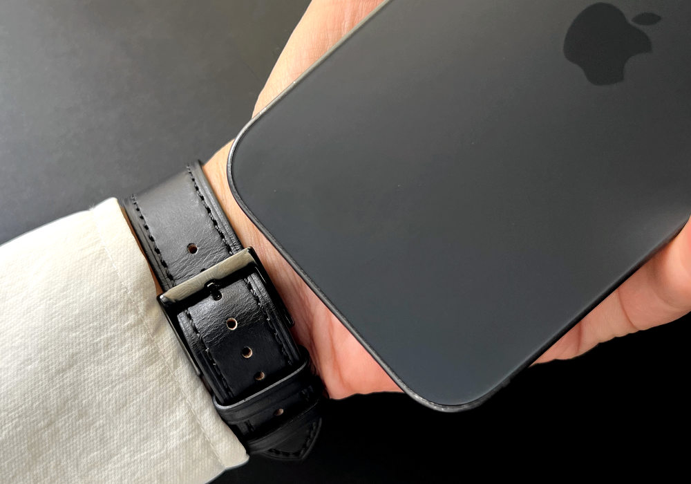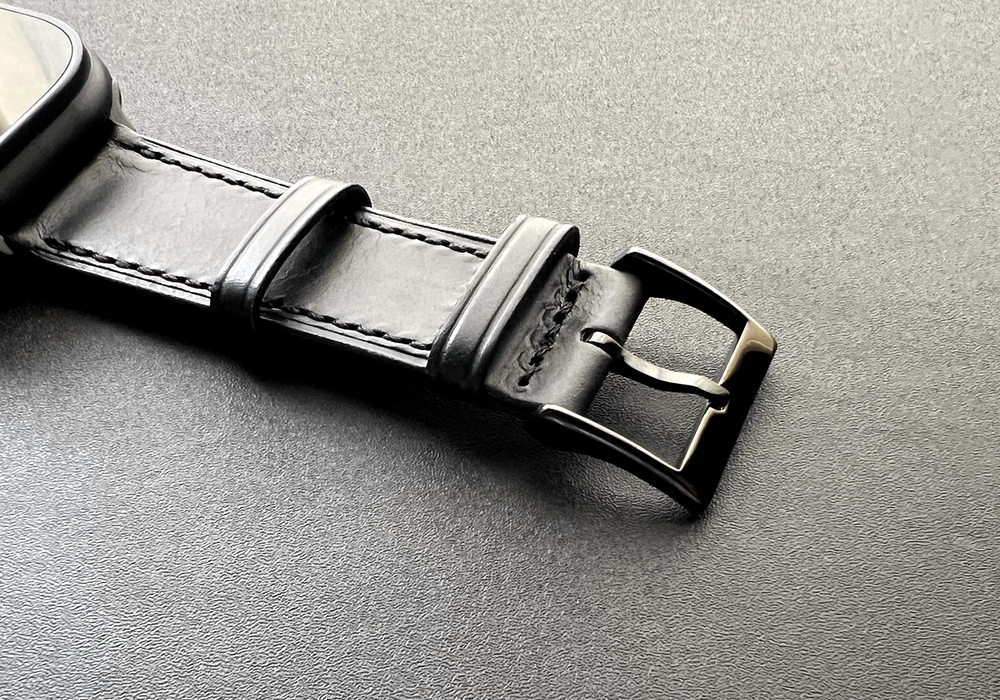 今回リリースされたレザーのカラーバリエーション。まずは、ブラック。シュッとしたフォルムにもご注目を。Seriesにも、Ultraにも合います。