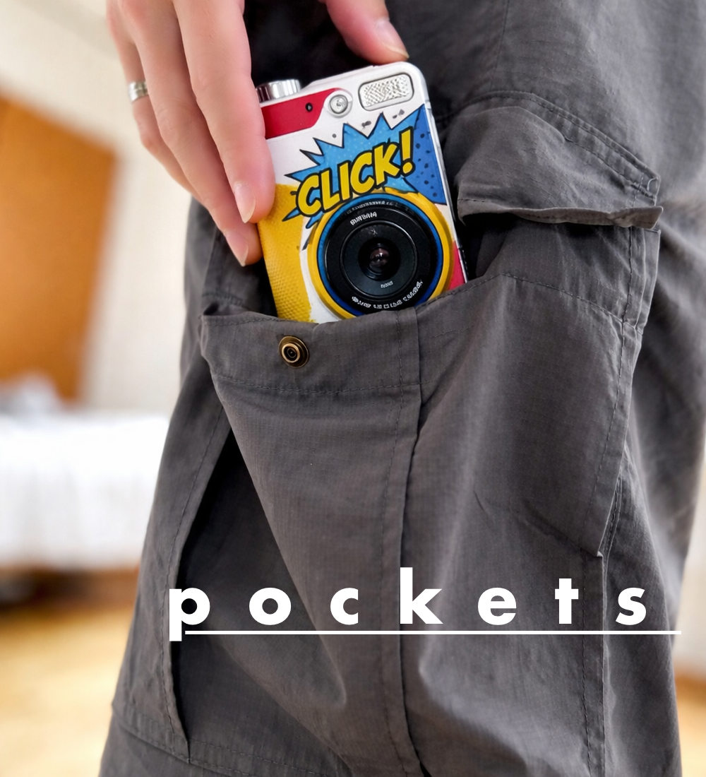 ロング、ショート共に、サイドにフラップポケット。フラップ部分は、ロングパンツがダブルホック、ショートパンツがシングルホックでしっかりと固定OK。