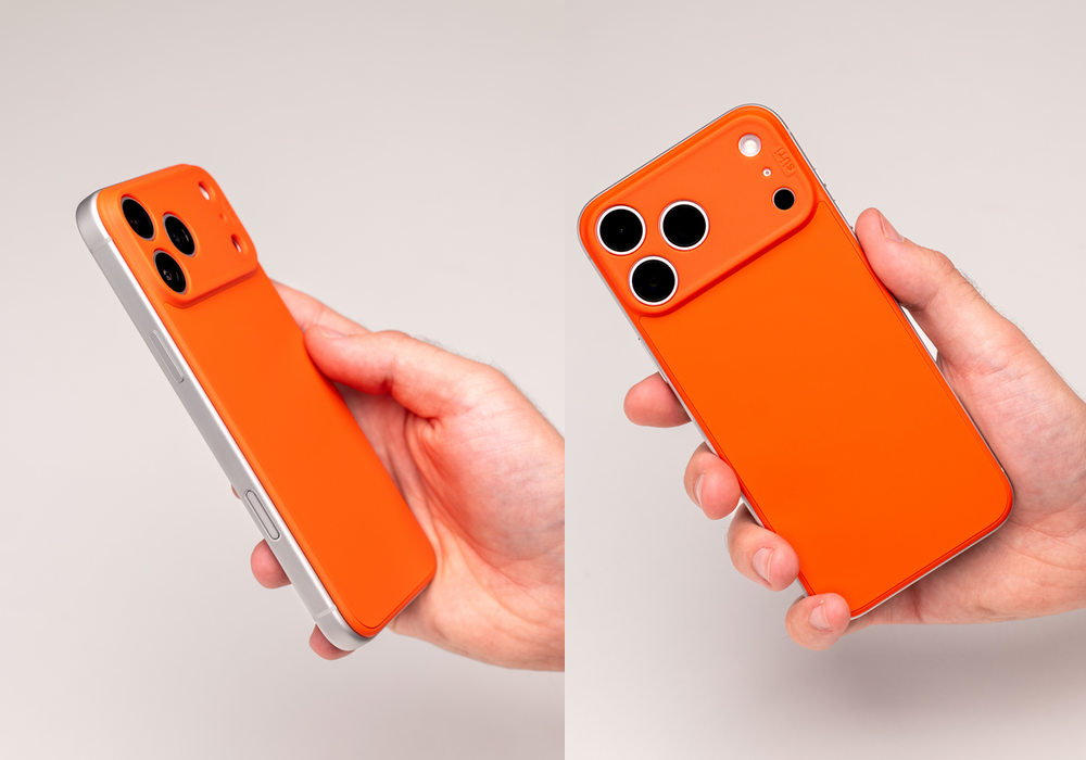 もう、まずはこの画像一発で、くらっちゃってください!シンプルに言うと、「Suti PhoneBackは、iPhone 17の背面と、今回のiPhoneから新しく大型になったカメラレンズモジュールを保護するパネル型(カバー型)ケース」です。側面は保護しません。しない代償として、たくさんのメリットを味わうことができます。