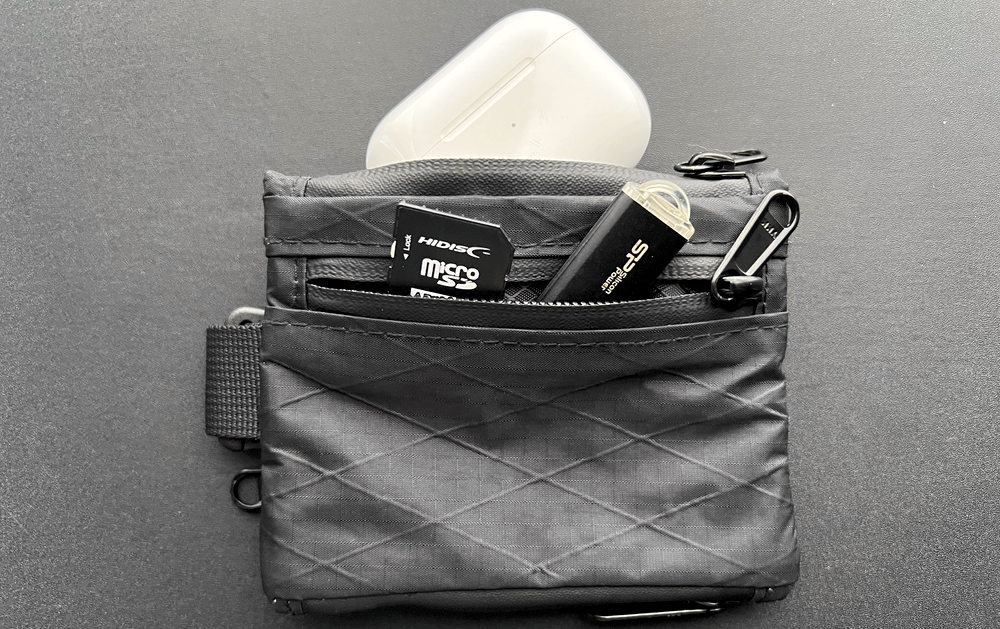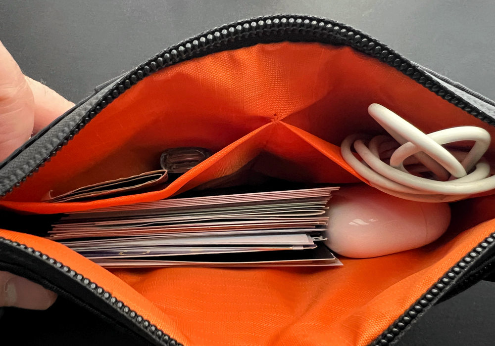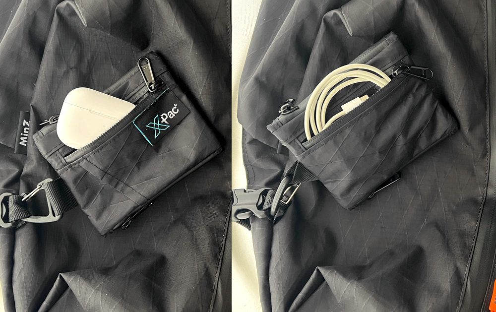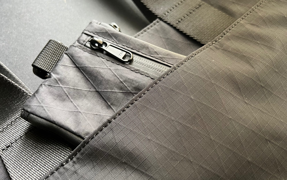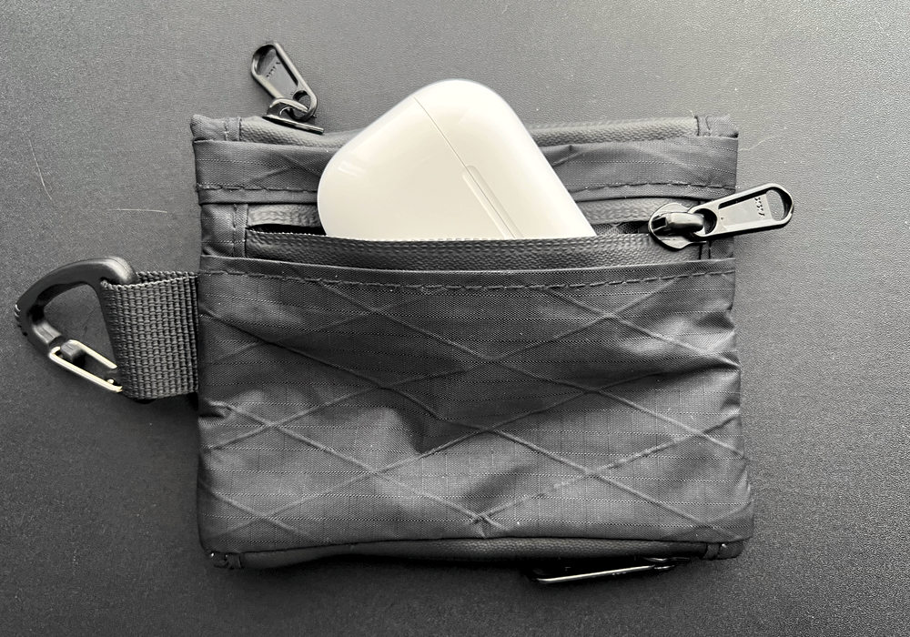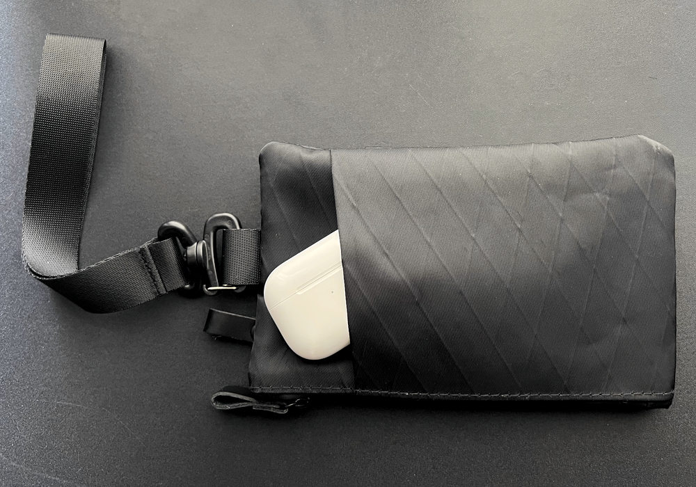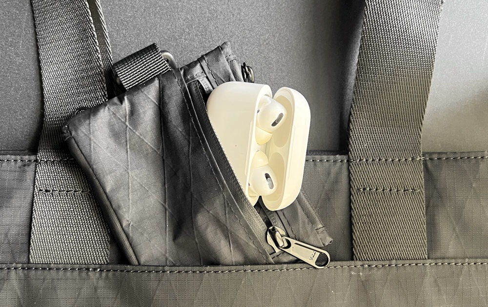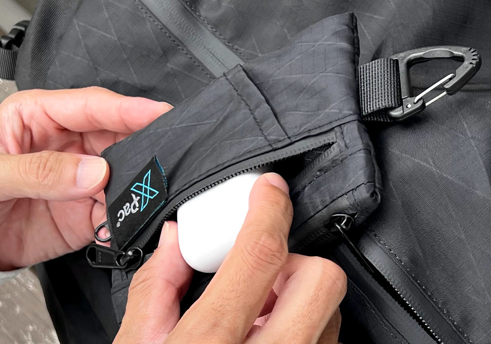 バッグの中をゴソゴソせずともAirPodsなどの出し入れができるのは、やっぱり良い。X-Pac®使用のバッグの方なら、もろにシームレスなデザイン感で使えるのでさらにオススメ。