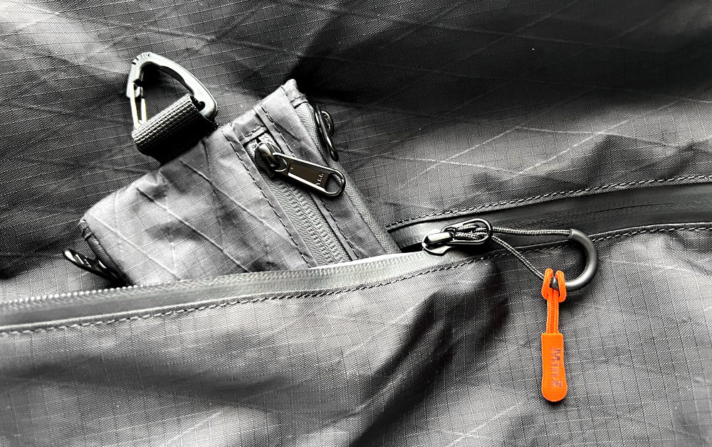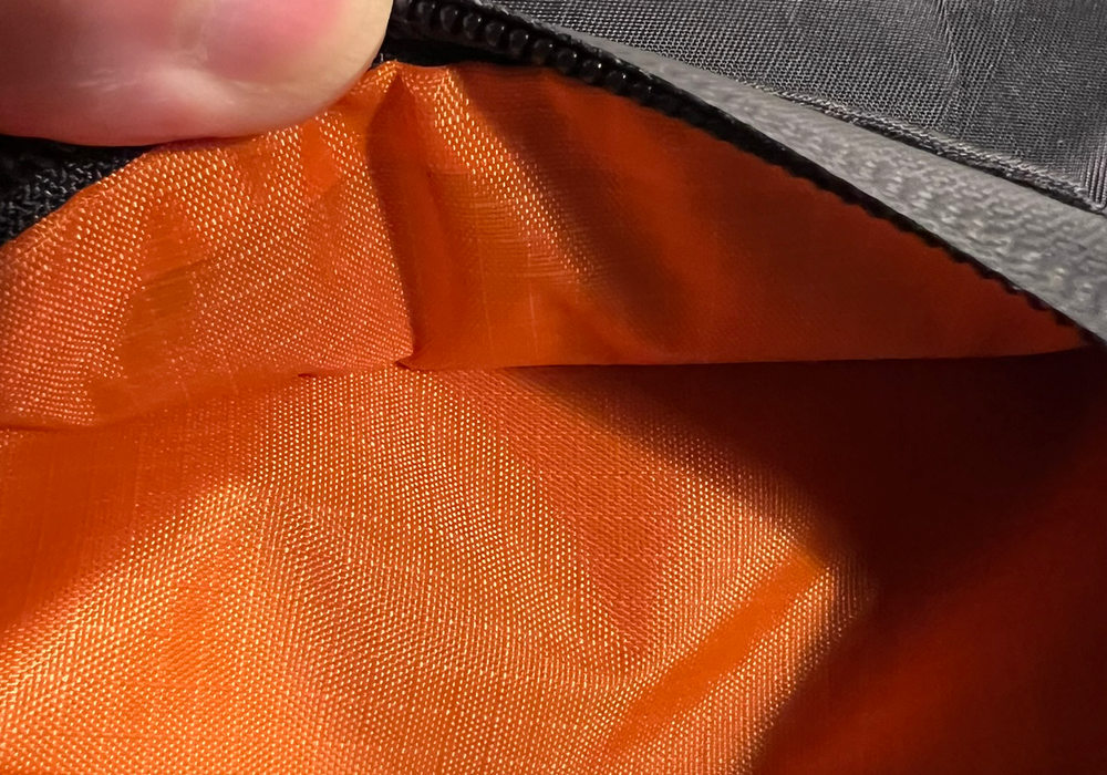 さらに、【S】【M】サイズにはこのX-Pac®に、リップストップ(生地の一部に引き裂けに強い糸を格子状に織り込むことで、万が一破れてもそれ以上裂け目が広がらないようにした生地)を加えて、さらなる軽量性と高い耐引裂性を実現。51グラム、55グラム。