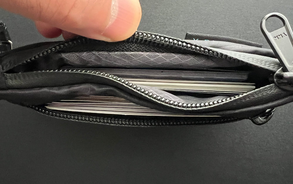 左ジップポケットに紙幣。クルッと回して逆側ジップポケットにカード。慣れると、パカッと開いて区分けするよりもスピーディー、スムースだと気づくハズ。なにより、見た目もスマート。