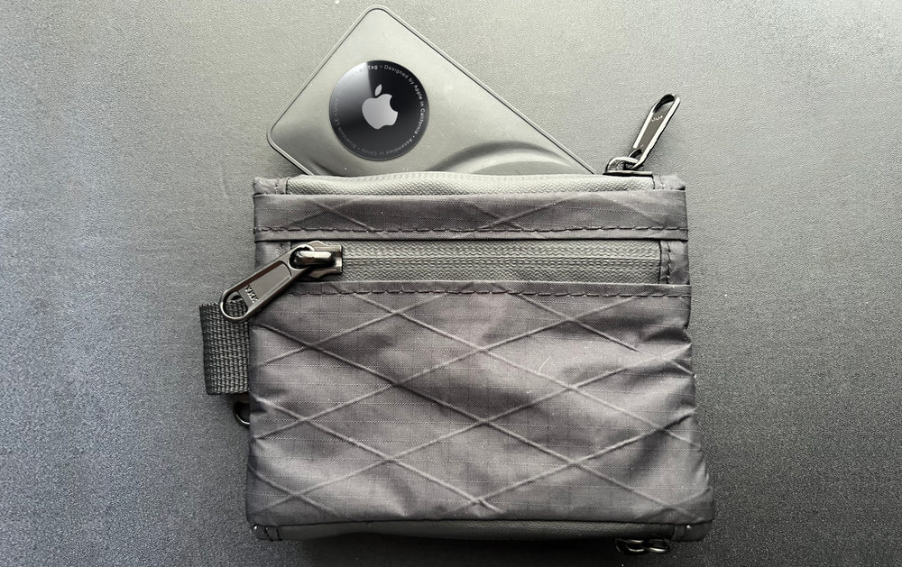【S】忘れちゃならないAirTag。もちろん、そのまま、ジップポケットに収納するも良し、カードアダプタに装着して収納も良し。ジップポケットだから紛失もナシ。MP2LのAirTagカードアダプタなら全サイズ収納OK。