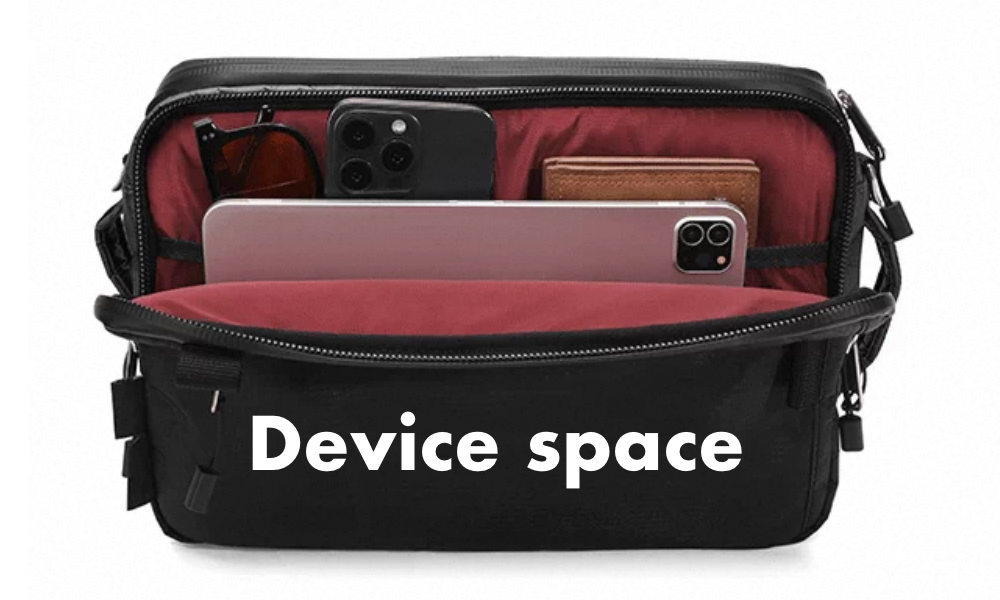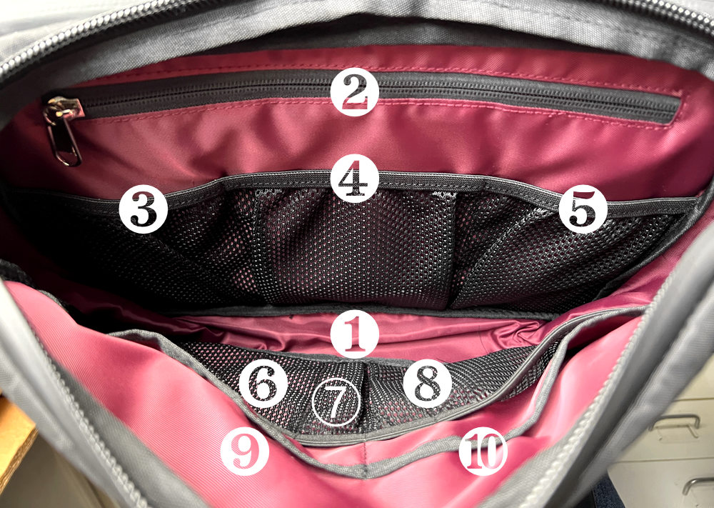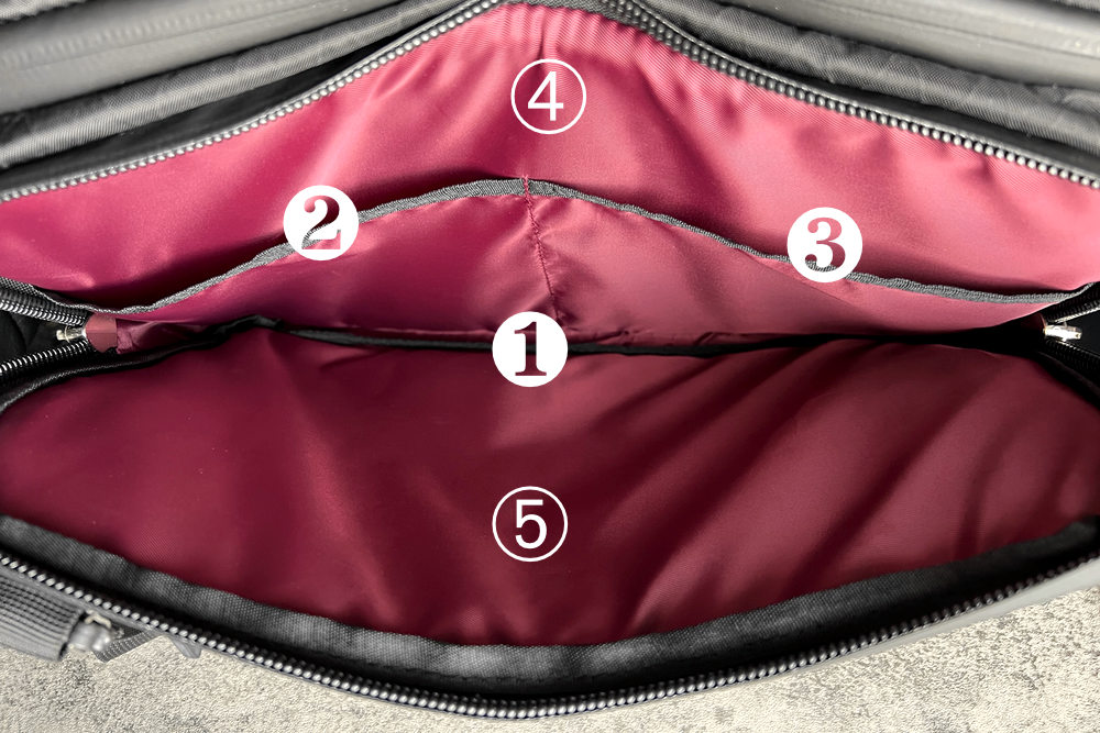 収納スペースは、大きく分けて、フロントポケット・バックポケット・メインスペース・デバイススペースの4箇所にレイアウトされています。