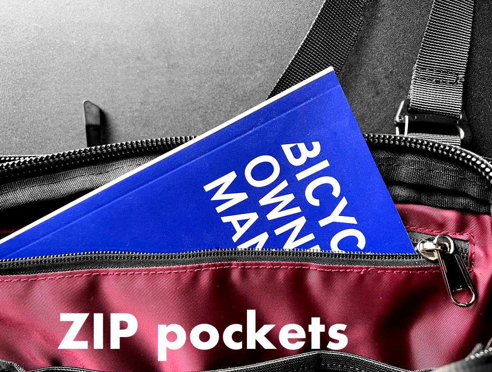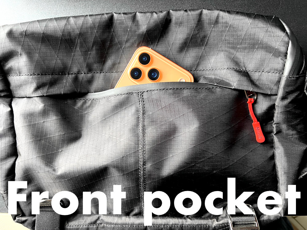 フロントポケットは、フラップ(蓋)とジップで構成。突然のちょっとした雨なども、まずはフラップで回避。さらに、止水ジップで内部収納アイテムは安全です。出し入れの頻繁な、iPhone、AirPods、ウォレット、コンデジなどの収納にも。