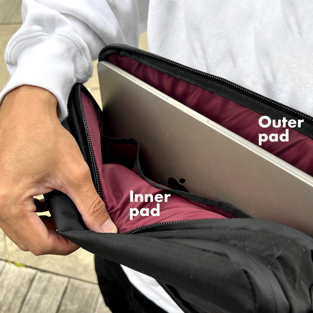 従来の素材に<リップストップ>を加えることにより、さらなる軽量性と高い耐引裂性の頑丈な組み合わせを提供。デバイス収納スペースには、<耐衝撃性保護パッド>内蔵。