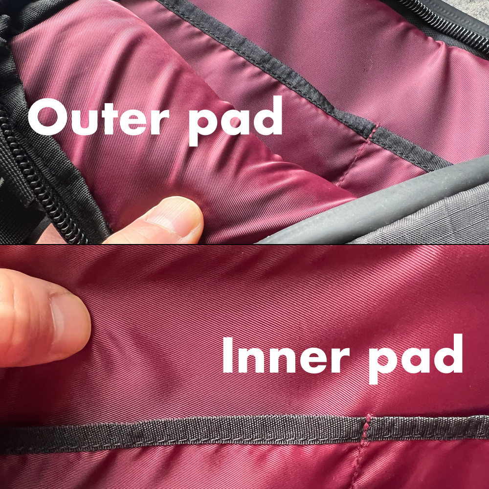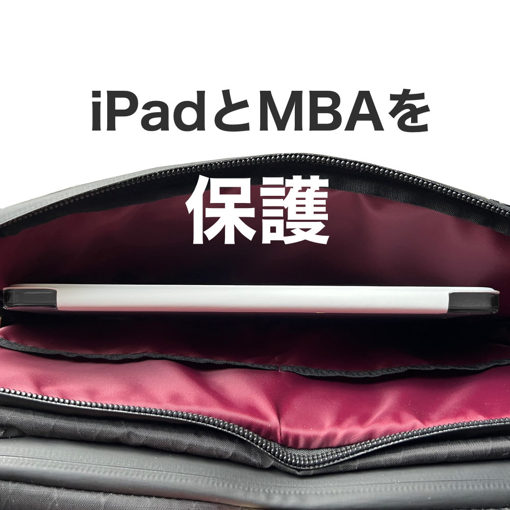 iPad/MBA収納スペース(背面側)は、耐衝撃性能を重視。背面内部と内側パテーションにパッドを内蔵。デバイスをしっかりとガードします。
