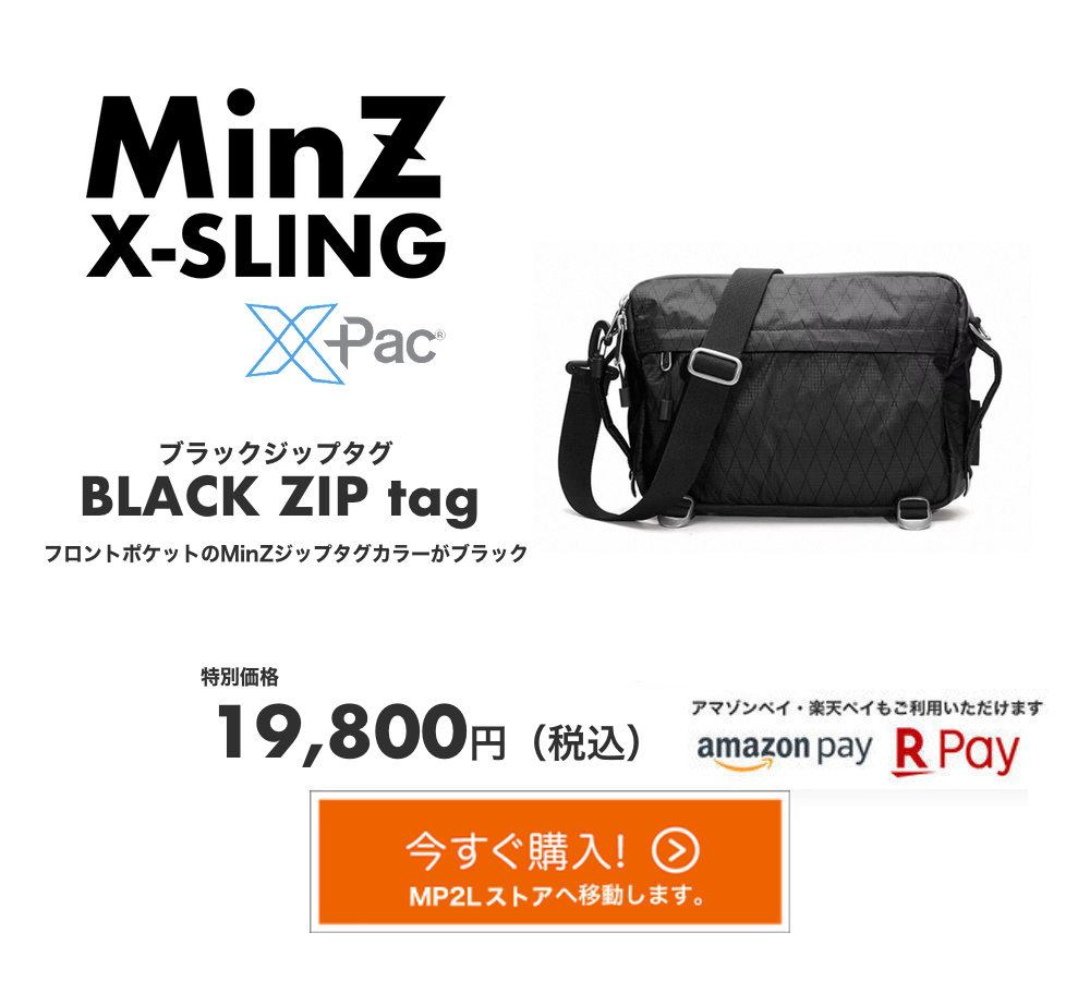 既にMinZのバッグシリーズではお馴染みのジップタグ。スリップ防止形状のジップタグで、開閉しやすく。ブラックとオレンジを選べます。もちろん、着脱も簡単。