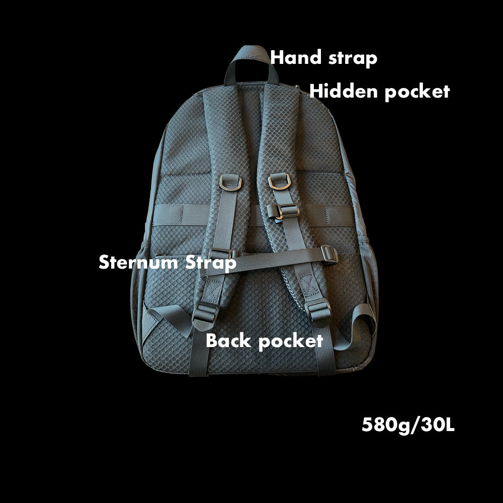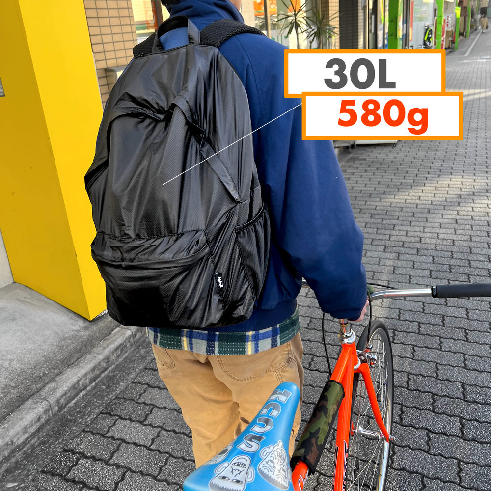 本製品は工場と共同開発した【MinZ リップストップナイロン】を採用。極薄ながら頑丈で、同サイズ平均約1kgの一般的なリュック/デイパックに比べ、0.58Kg(580g)という半分近い軽さを実現しました。30Lの大容量で、2泊3日の旅行にも対応します。