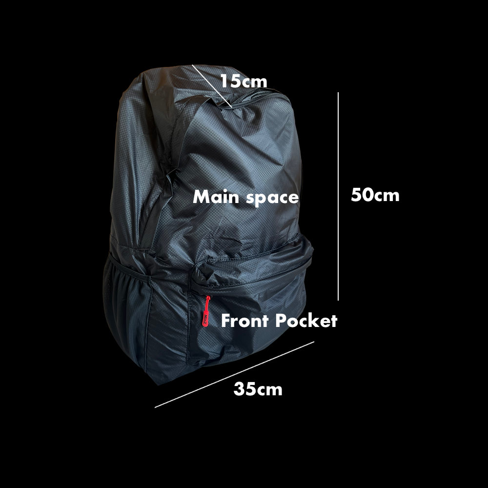 工場との共同開発により完成した、リップストップ仕様の極薄で頑丈なナイロン。パッカブルリュック、エコバッグ、ナップサックなどの【極薄ナイロン】で、耐重性、耐引裂性を実現。同サイズのリュック(平均1Kg前後)と比較すると圧倒的に軽い580g。そして、30Lまでの容量のアイテム収納が可能です。