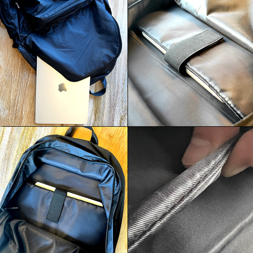 580gで30L容量を実現した「MinZ DAYPACK Air」。流行のナップサック、パッカブルリュック、エコバッグなどに使われる極薄ナイロンの軽さは魅力的な一方、「デバイス収納が不安」「背中がゴツゴツする」「耐荷重が不安」といった理由でメインバッグとして使うには不向きでした。