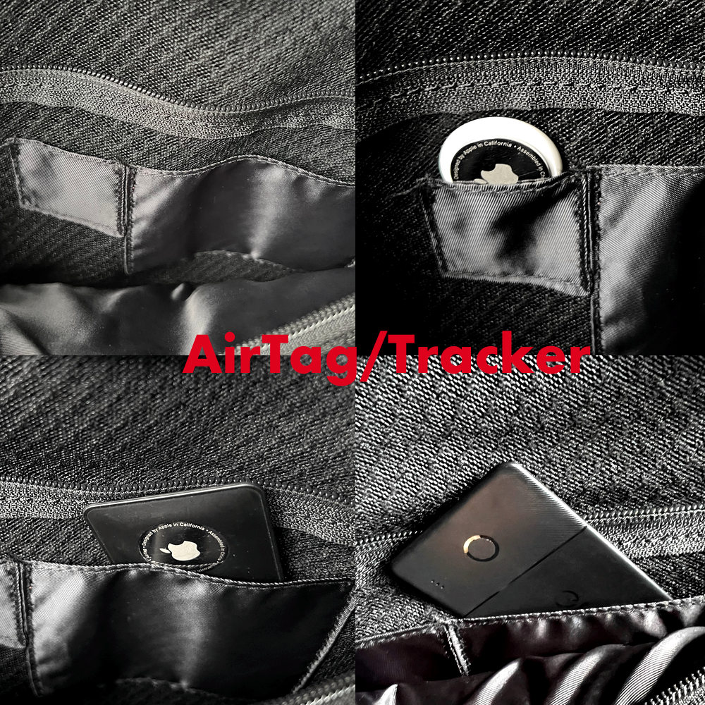 AppleのAirTagがそのまま入る小さなポケットと、各社のカード型トラッカーが入るポケットを、背面ポケット内に搭載。