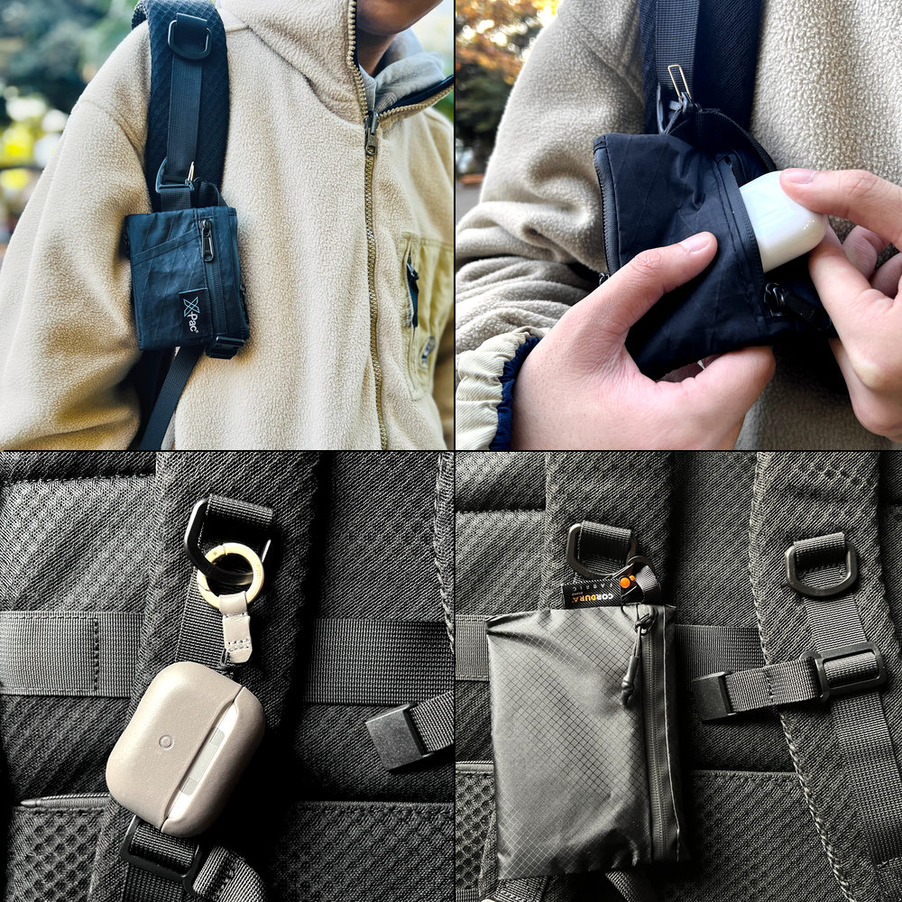 iPhone、ウォレット、ポーチ、薬、カメラ、AirPodsなど、出し入れが頻繁なアイテムの収納に。