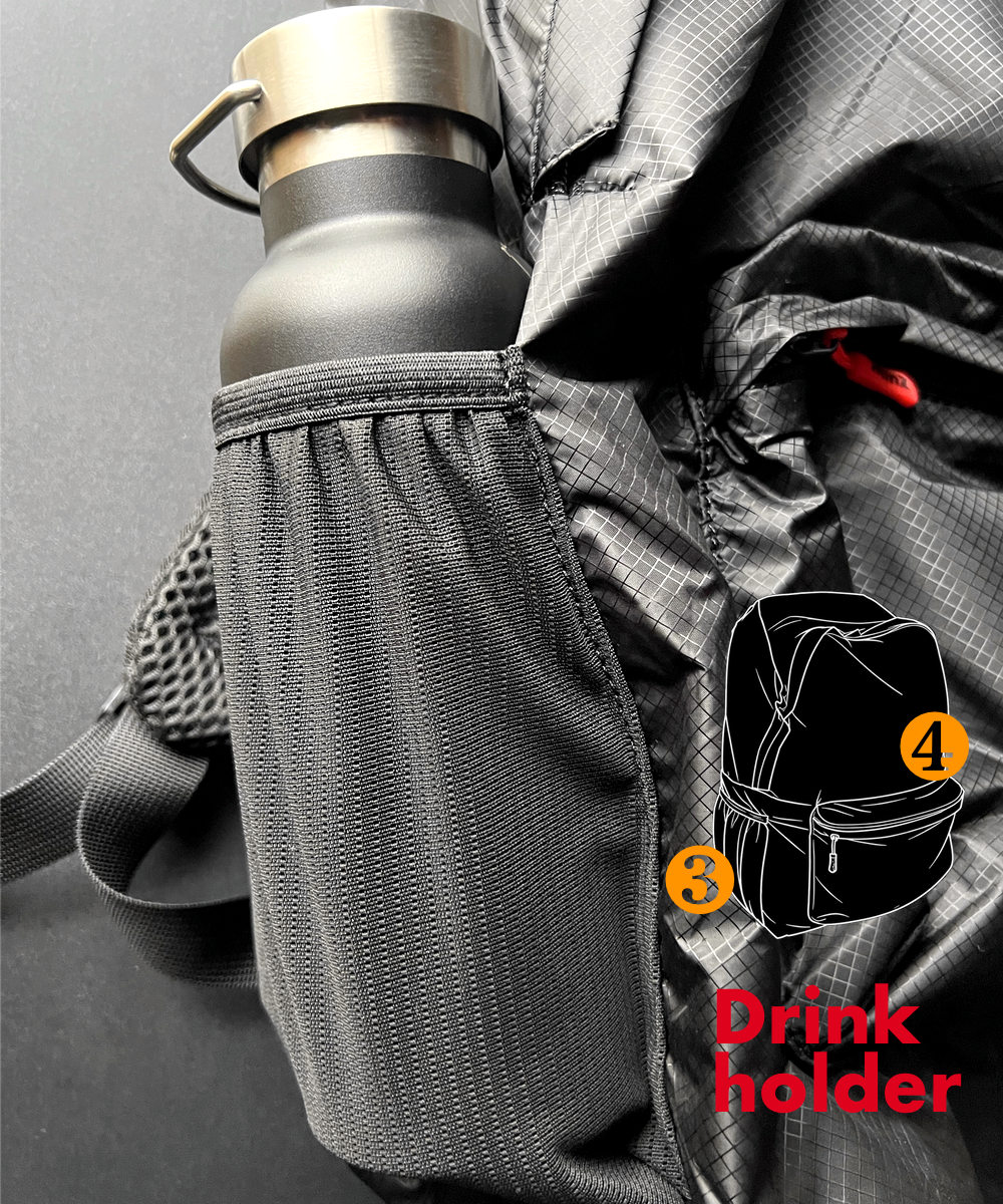 左右にドリンクホルダーを搭載。ボトルは濡れていることも多いため、メッシュ状のソフトナイロンで製作。乾きやすい仕様になっています。
