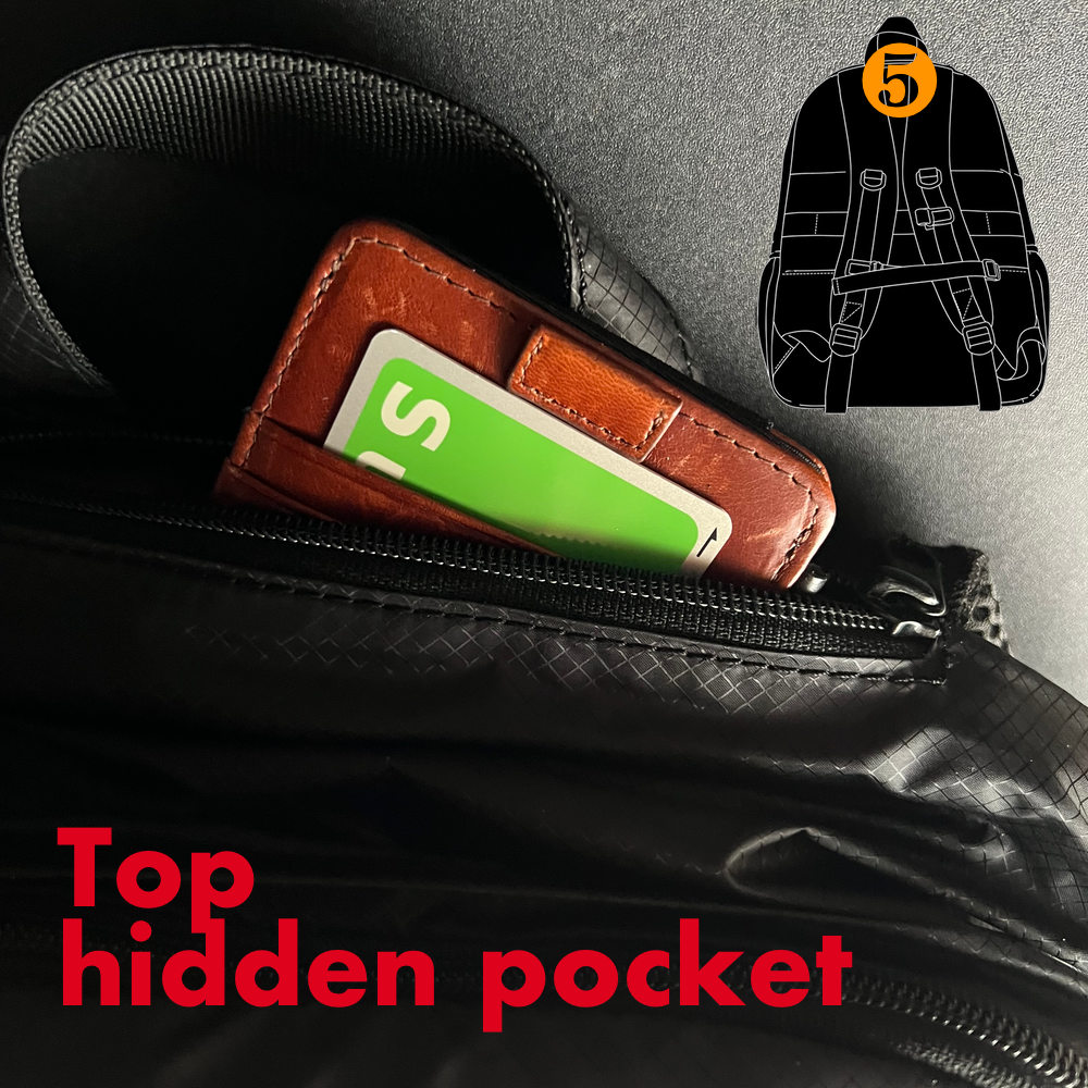 トップの目立たない場所に、小さな隠しポケットを搭載。最も早く、収納アイテムを取り出せる位置です。ミニウォレットなどの収納に使えます。