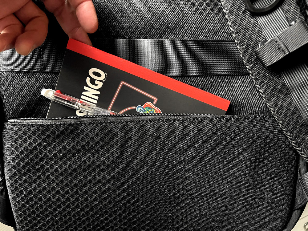 隠しポケット的に、目立たないスペースにレイアウトされています。メモ帳など紙のアイテム、ウォレット、ポーチなど。