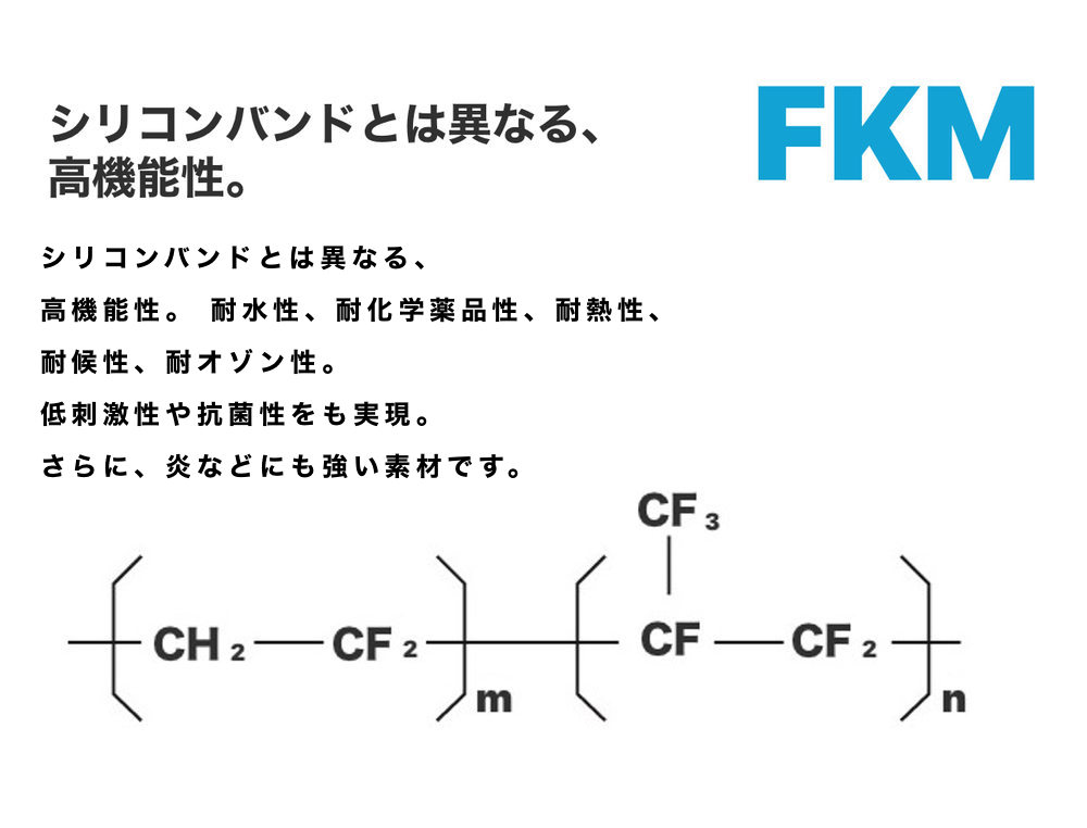FKMは、手首の重量を軽く抑え、耐油性、耐化学薬品性、耐熱性、耐炎性、耐候性、耐オゾン性などに優れている秀逸な素材。100%防水なので、手洗いから、水泳まで問題なくご利用いただけます。
