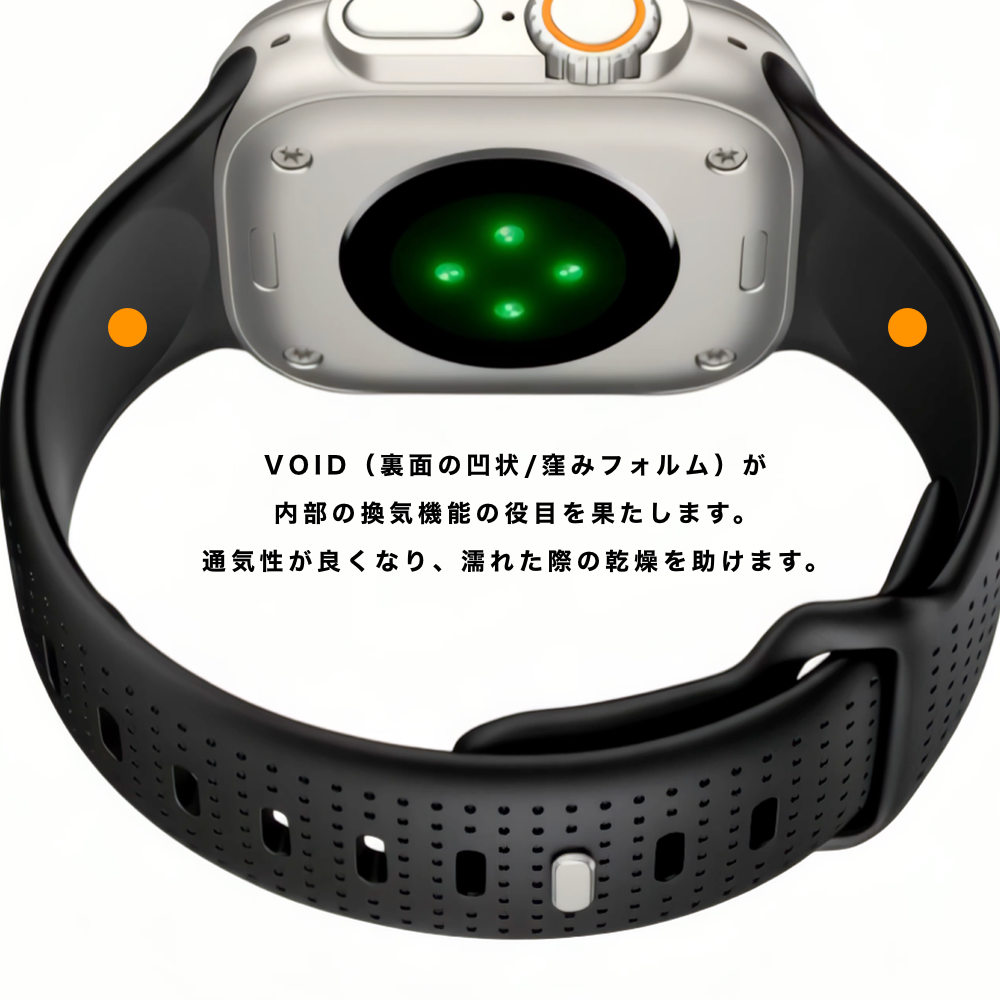 裏面は窪みのある凹状の通気性に優れるフォルム。手洗い中の水や、スポーツ中の汗が手首に溜まるのを防ぎます。
