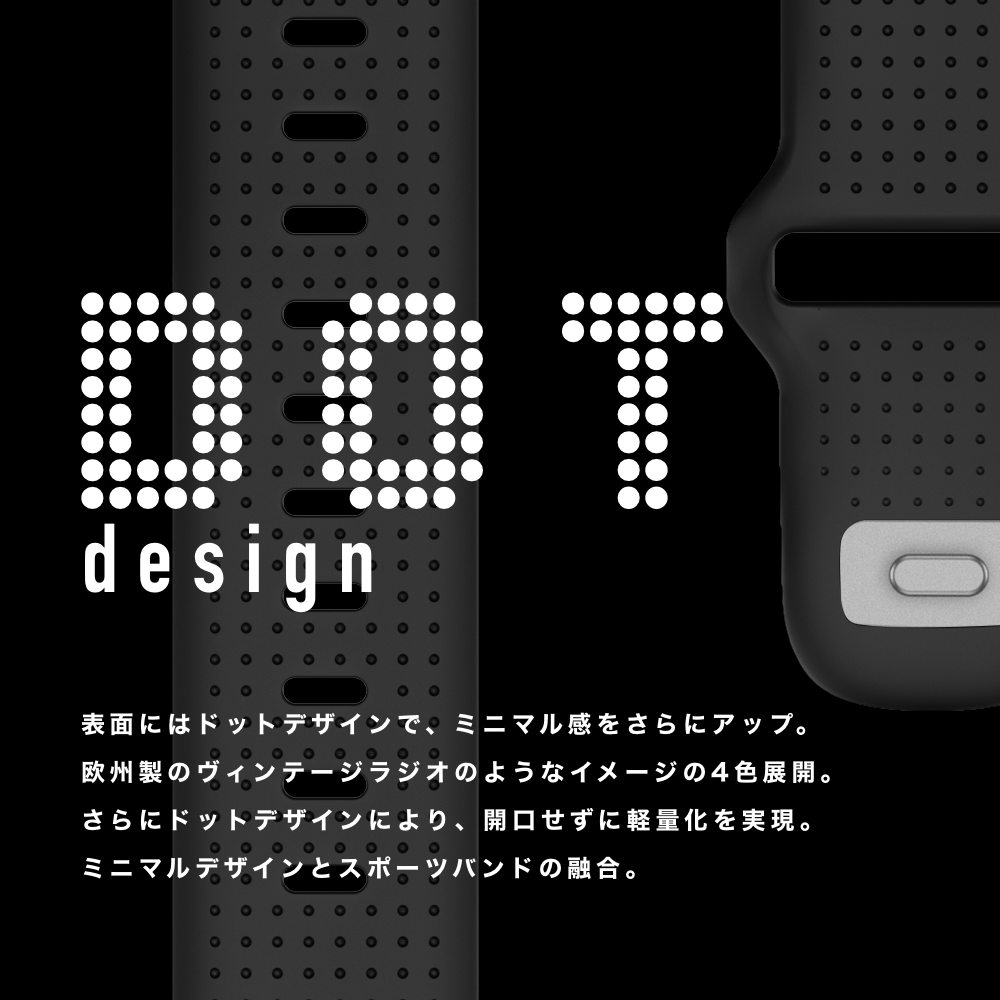 MinZ FKM mono Bandでもお馴染みのシンプルなミニマルデザイン。表面にはドットデザインで、ミニマル感をさらにアップ。欧州製のヴィンテージラジオのスピーカーのような趣も。