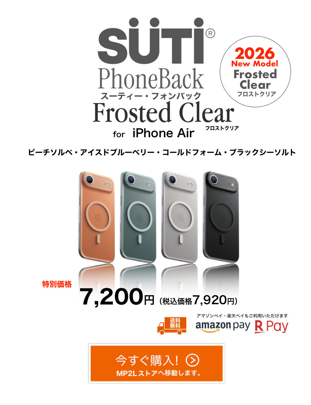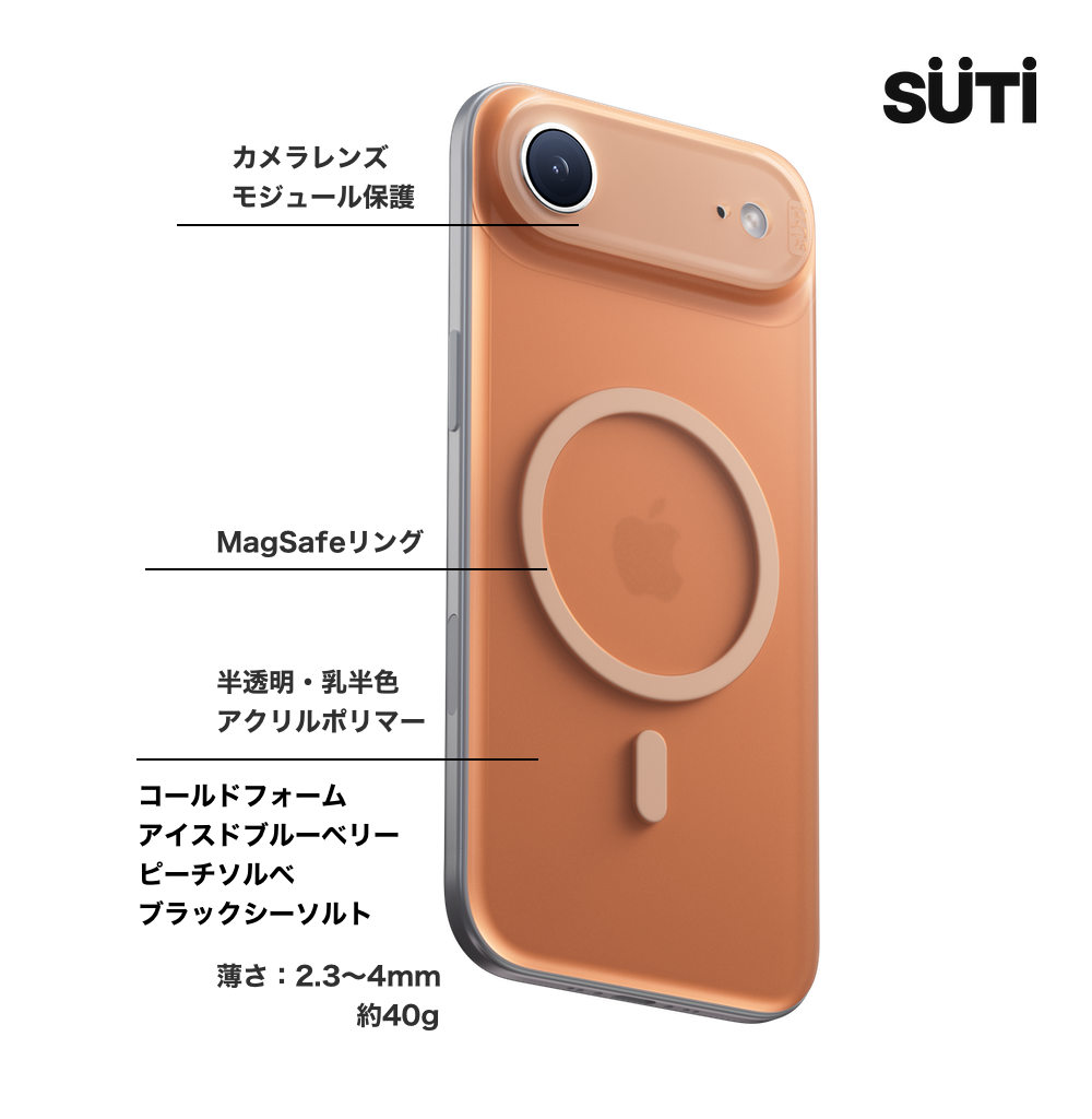 Suti PhoneBackは、ケースなしでiPhone本来のデザインや質感を楽しみたい人向けに設計。サイズやグリップ感を損なわず、マグネットで簡単に着脱でき、ズレずに固定される。カメラも保護しつつ画質への影響はなし。MagSafe完全対応で強力な磁力を備え、各種アクセサリも使用可能。4色展開で、iPhoneの美しさをそのまま活かせる。国内サポートも充実。