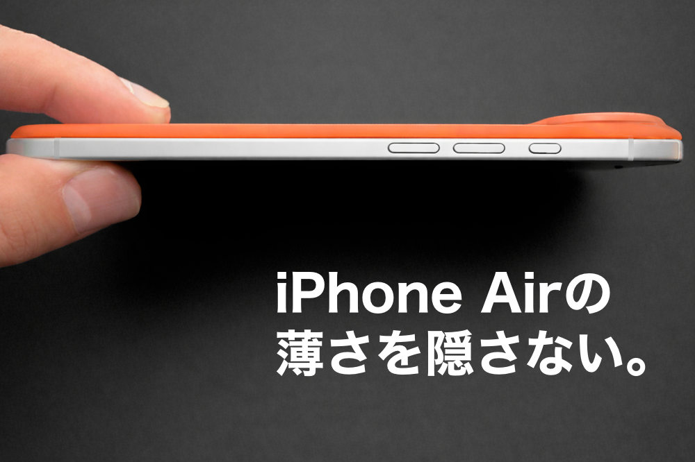 iPhone Air。歴代iPhoneで最薄の驚異的で、美しい薄さ。ケースやバンパーにより、iPhone Airの一番の特長とも言える、この薄いデザインも隠れてしまいます。
