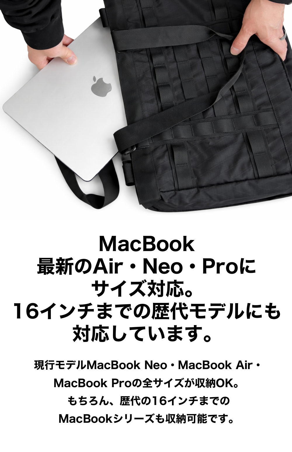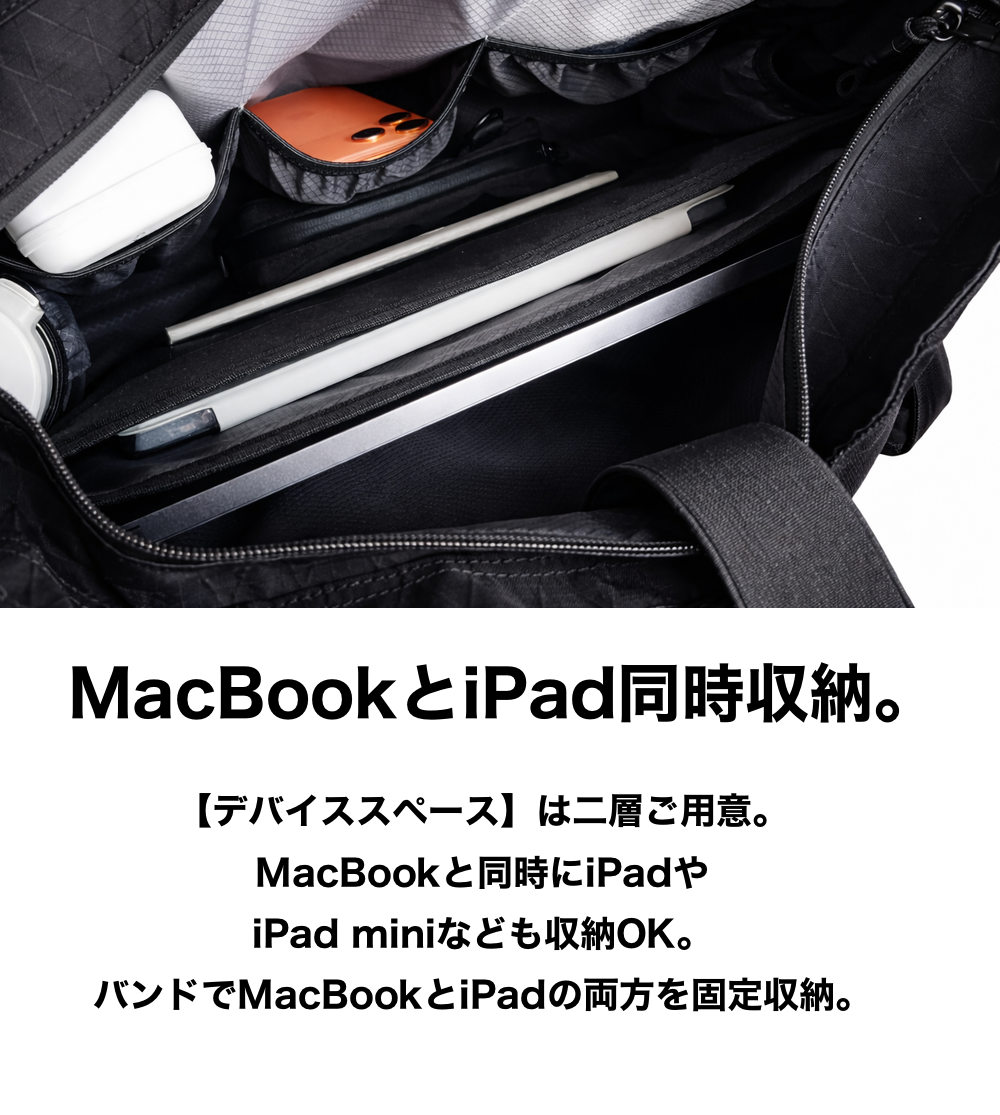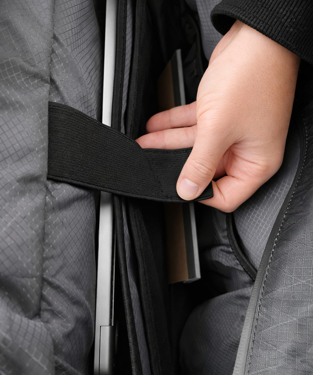 MacBook用の固定バンドを搭載しています。ベルクロで自由なサイズ調整が可能です。