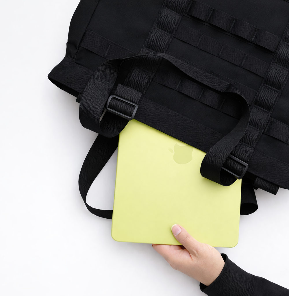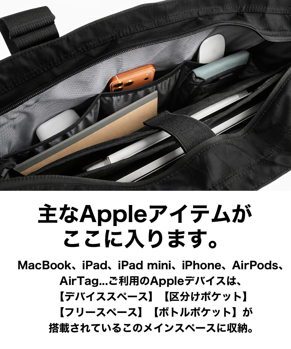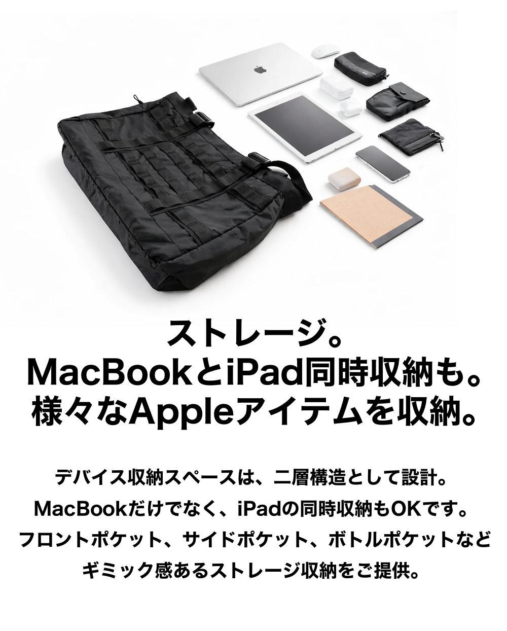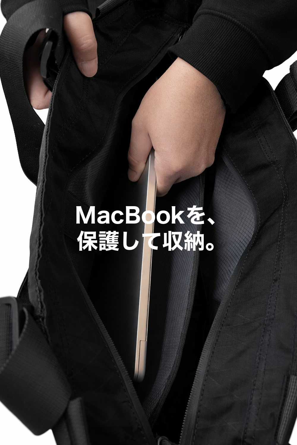 MacBook用の固定バンドを搭載しています。ベルクロで自由なサイズ調整が可能です。