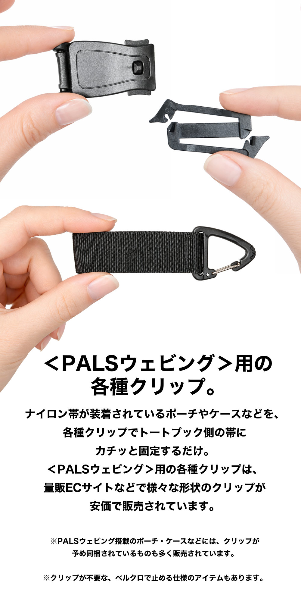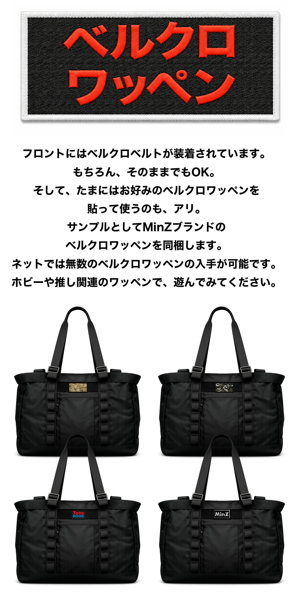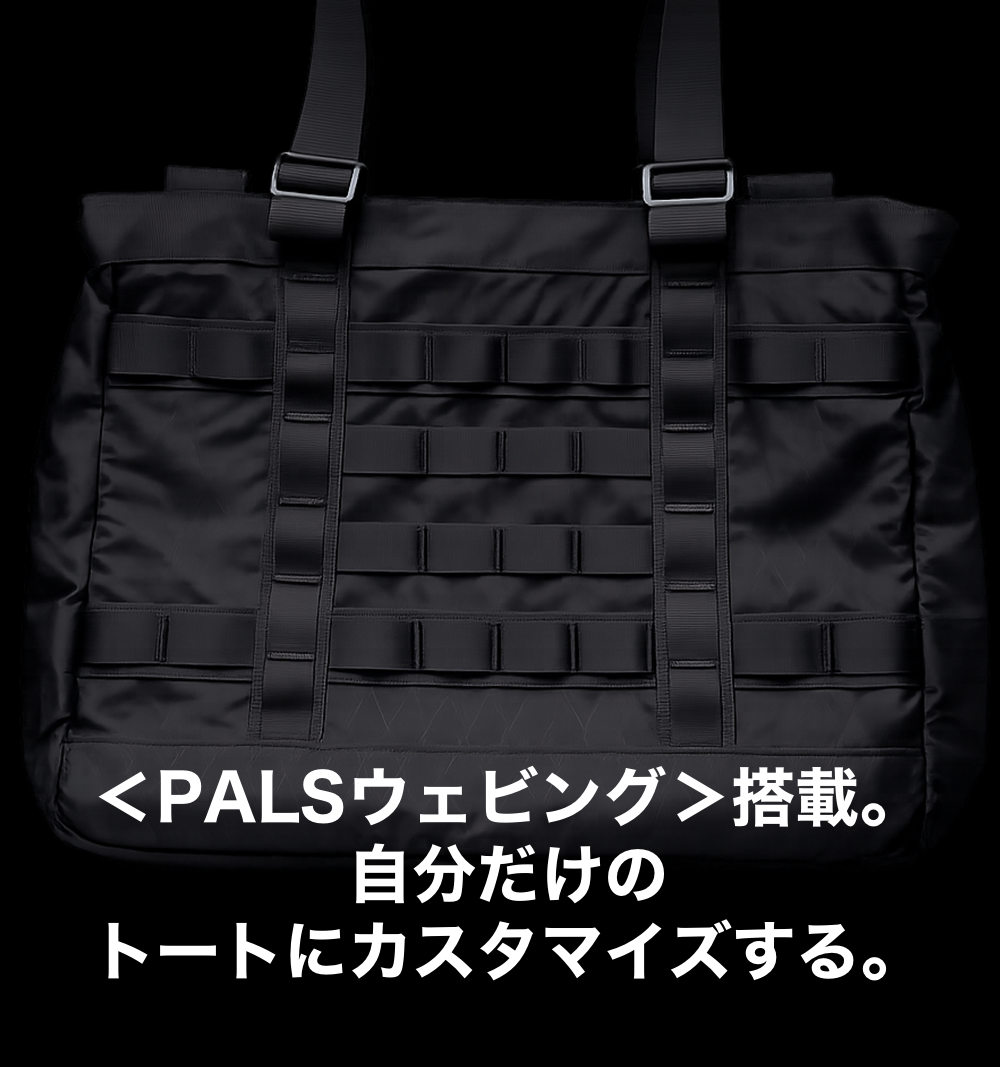 MinZトートブックの表面に縫い付けられている帯が<PALSウェビング>。デザインのアクセントにもなっているこの複数の帯を使用して、ポーチ、キーリング、ケースなど様々なアイテムを簡単にバッグに装着することができるのです。