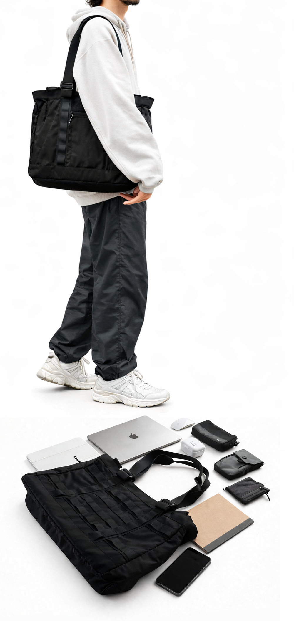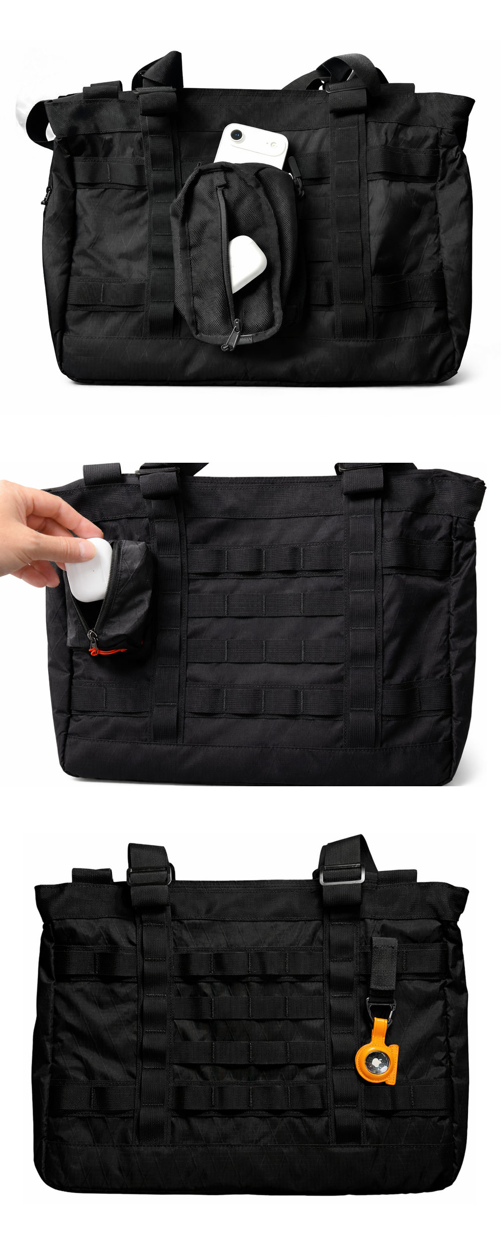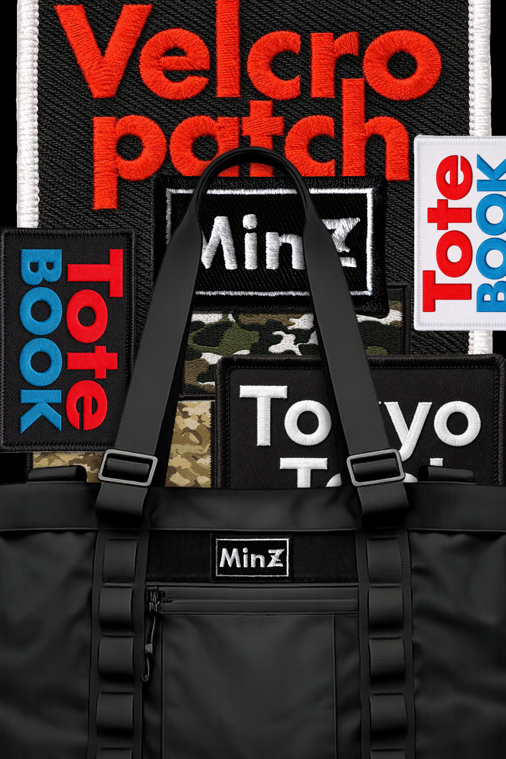 MinZトートブックの表面に縫い付けられている帯が<PALSウェビング>。デザインのアクセントにもなっているこの複数の帯を使用して、ポーチ、キーリング、ケースなど様々なアイテムを簡単にバッグに装着することができるのです。