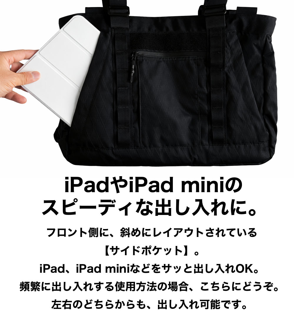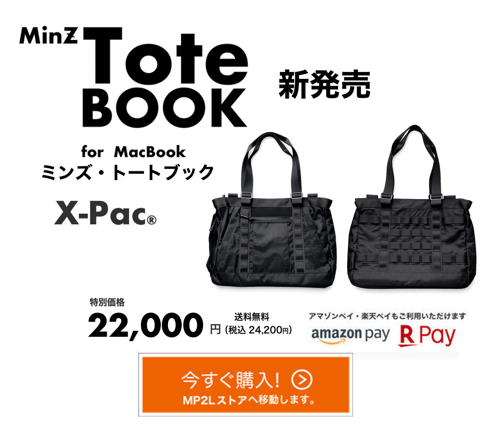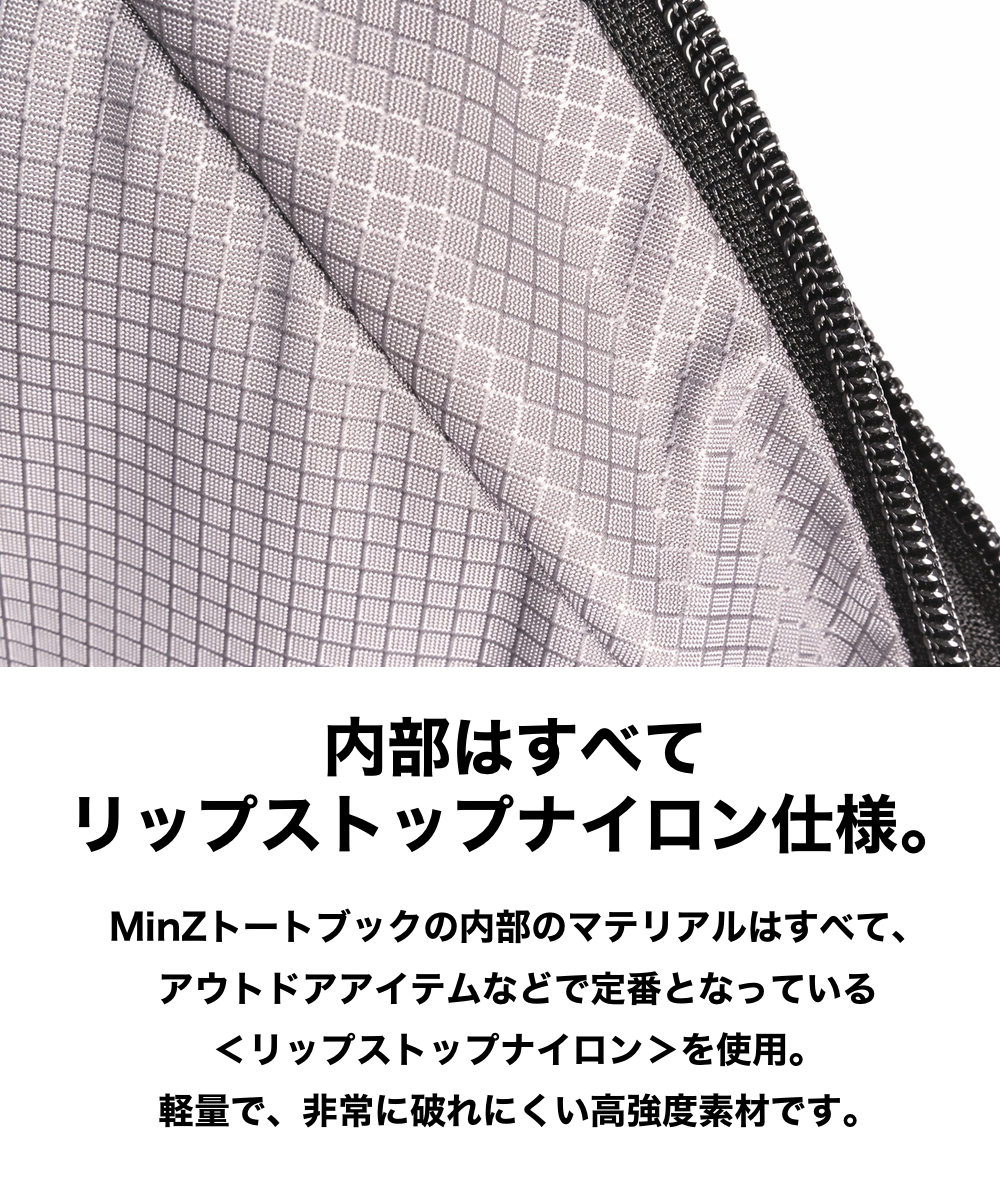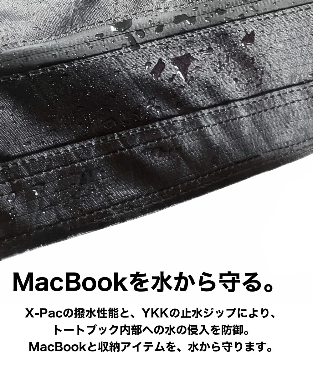 セイルクロスで世界トップクラスのシェアを独占するディメンョンポリアント社の新素材X-PAC(エックスパック)。MinZ Tote Book for MacBookには、この素材の進化バージョン<X-Pac VX07>を使用。<リップストップ>を加えることにより、さらなる軽量性と高い耐引裂性の頑丈な組み合わせに成功しています。もちろん、完全撥水仕様です。