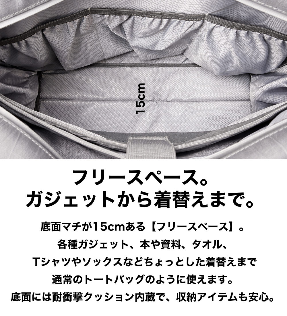 底面には、バッグを床面に置く時の耐衝撃用に、厚めのパッドを内蔵しました。